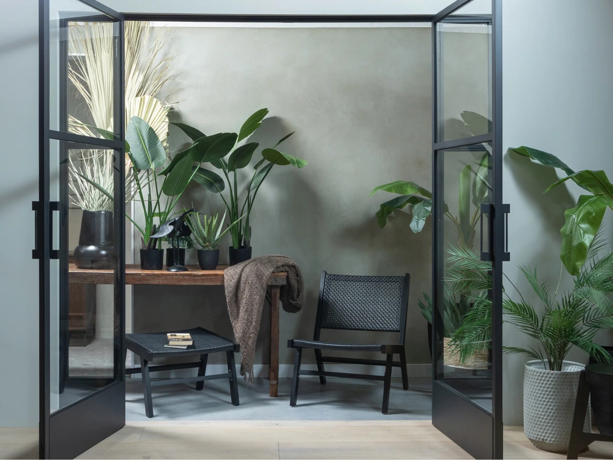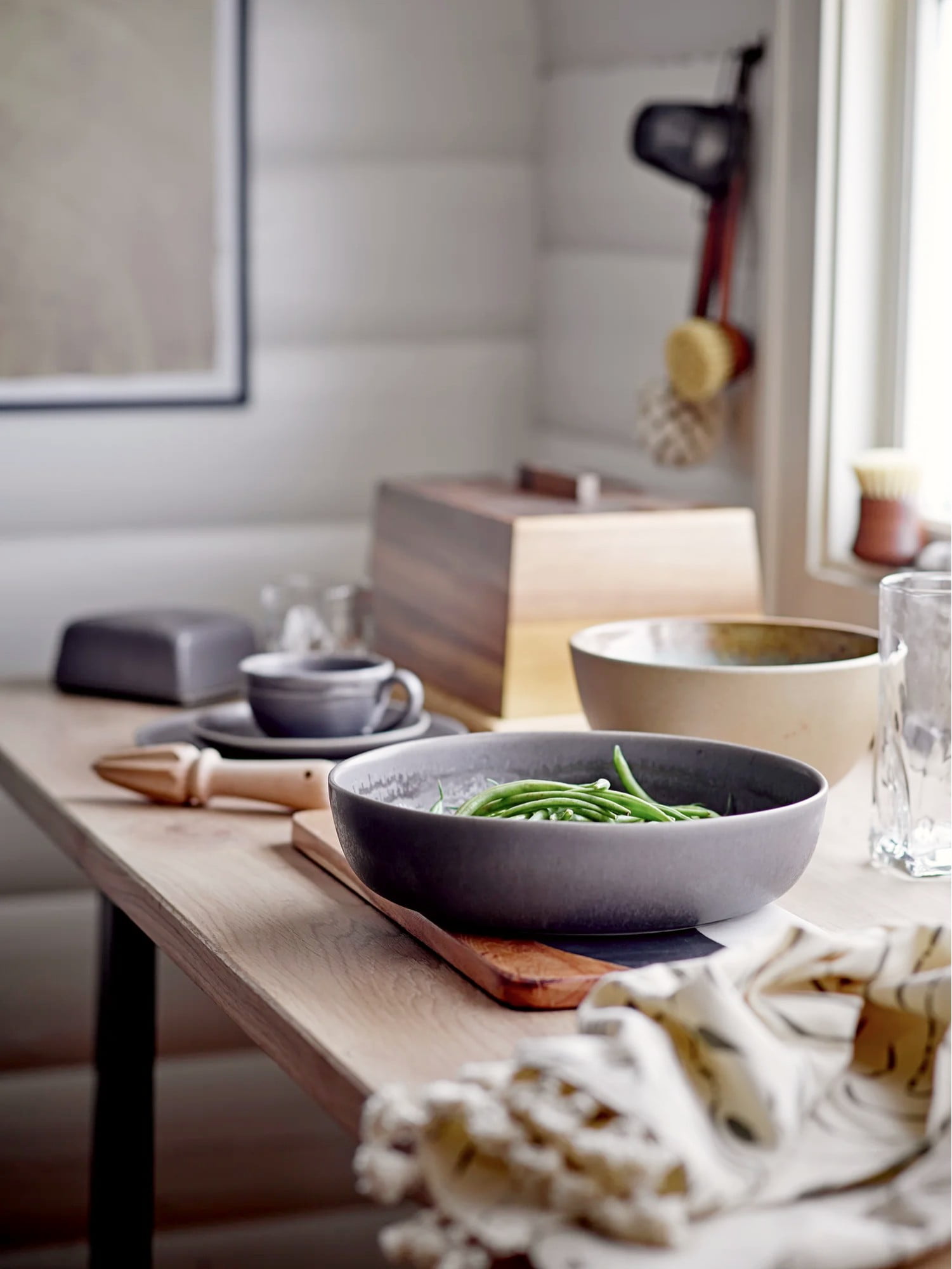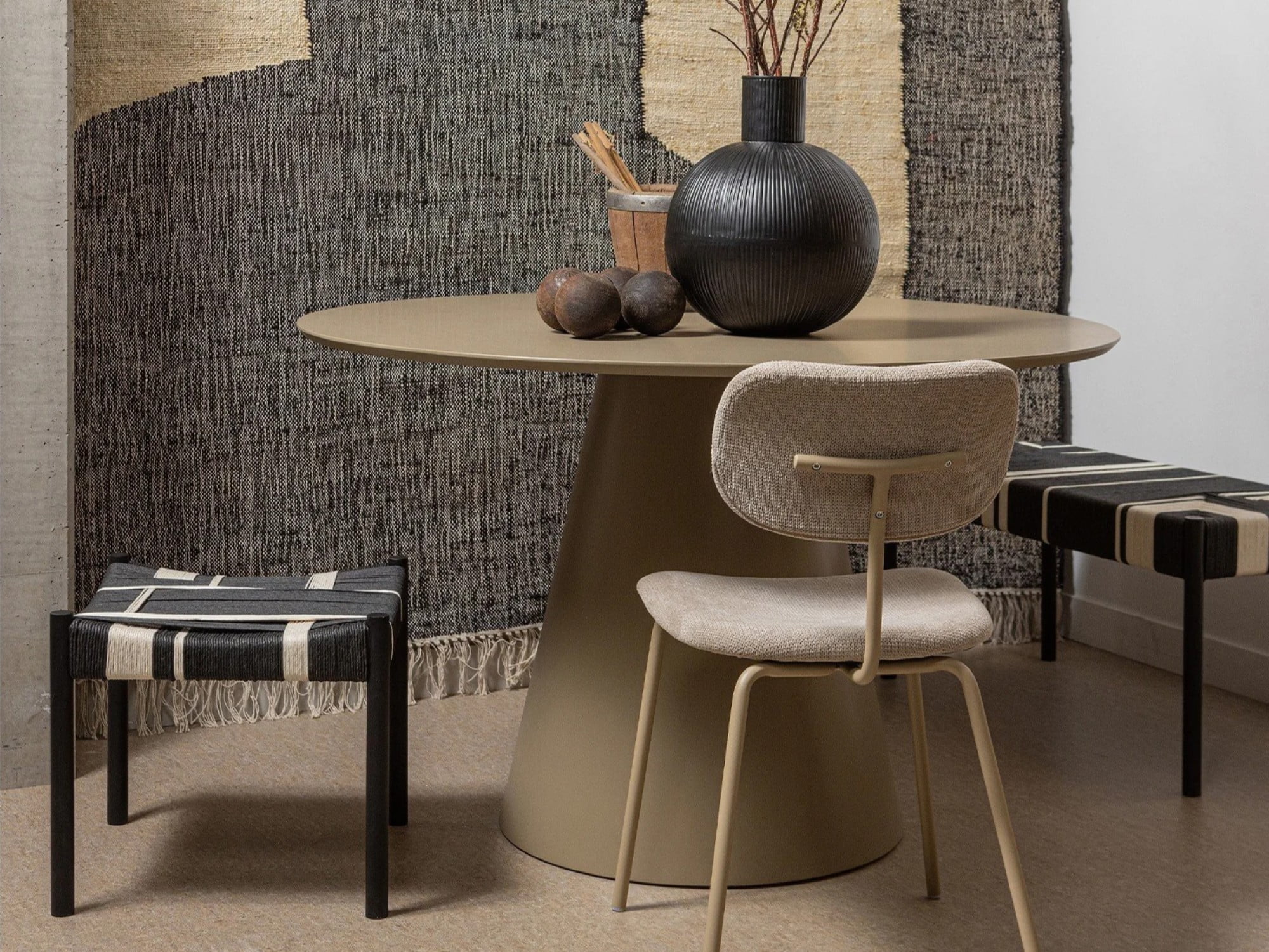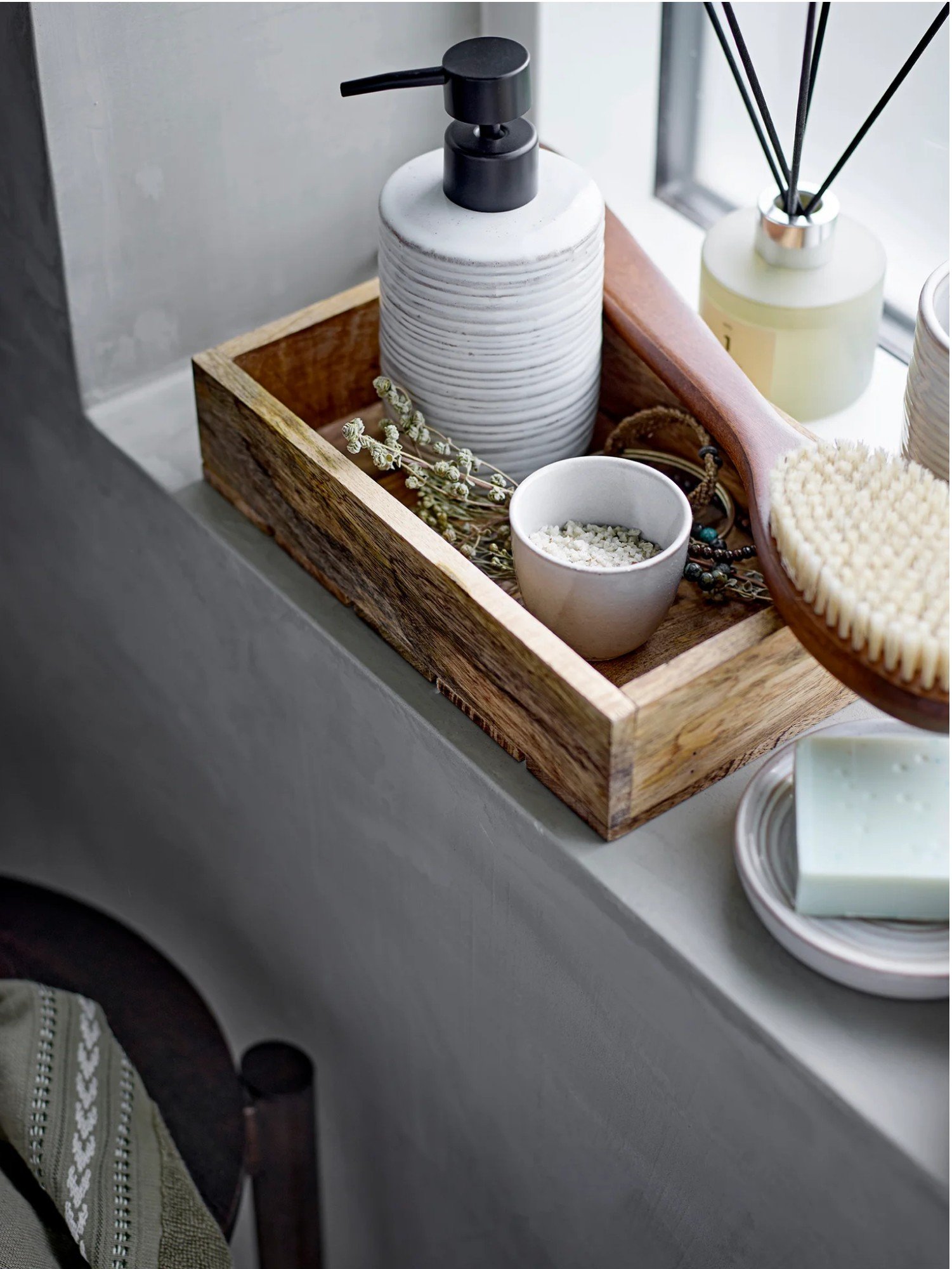 Držte sa neutrálnej farebnej palety — biela, béžová, teplá sivá, tlmená zelená. Pridajte jemný kontrast keramikou alebo textíliami v indigovej, antracitovej alebo zemitej hrdzavej farbe. Cieľom nie je monotónnosť — ale vizuálna harmónia.
