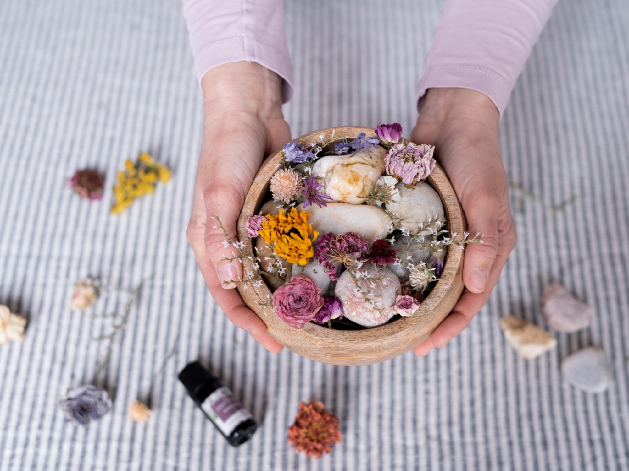 Drevená miska plná sušených kvetov a okruhliakov môže byť aj krásny voňavý darček pre niekoho blízkeho.
