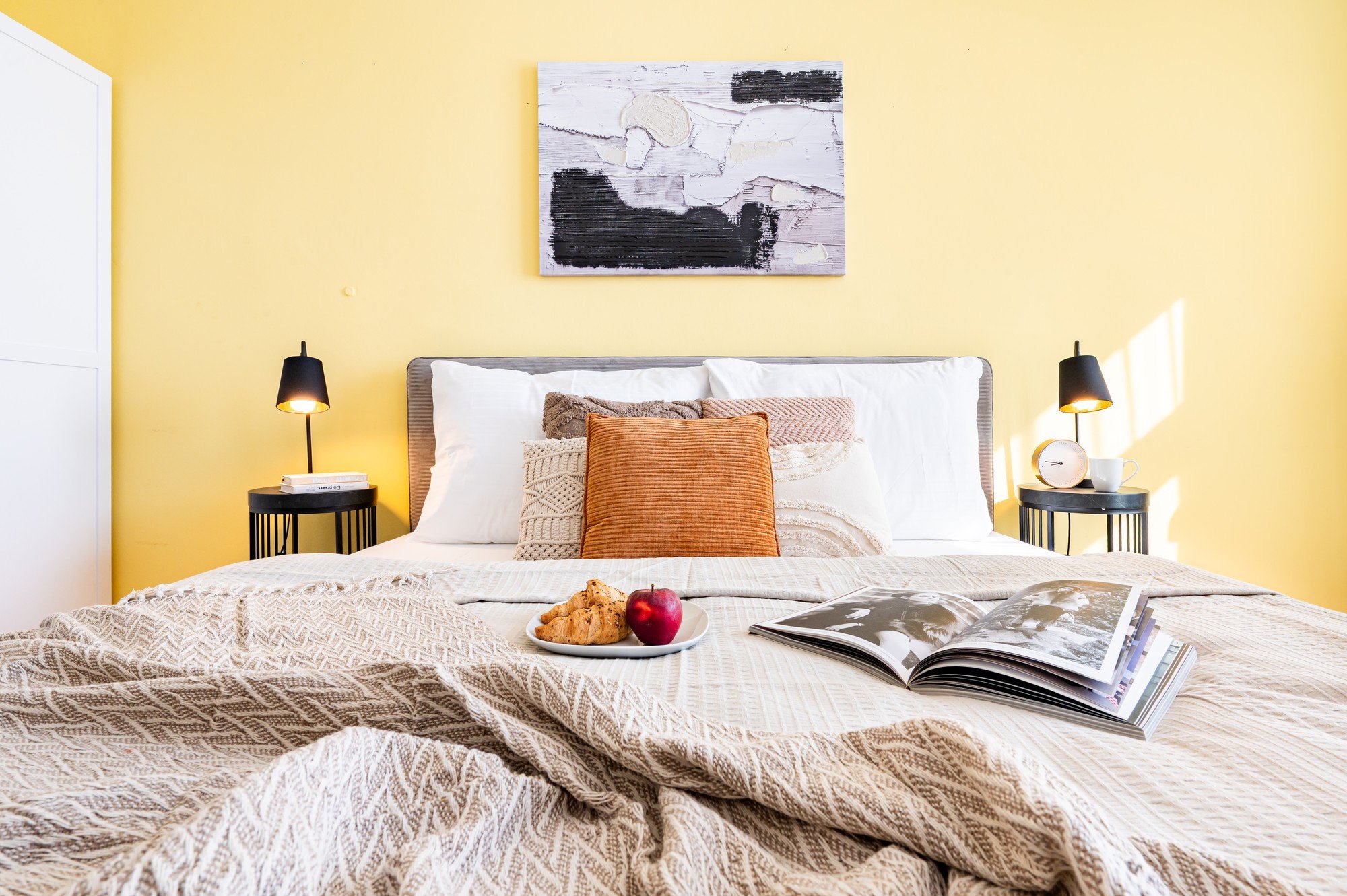 Priestor je svieži, optimistický a harmonický, s teplým žltým akcentom, vrstvenými textíliami a detailmi, ktoré zo spálne robia útulné, ale zároveň moderné miesto na odpočinok.