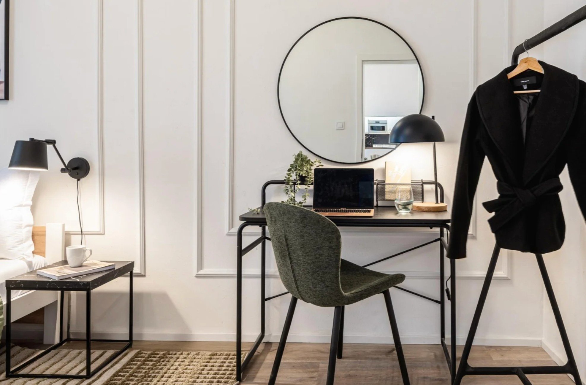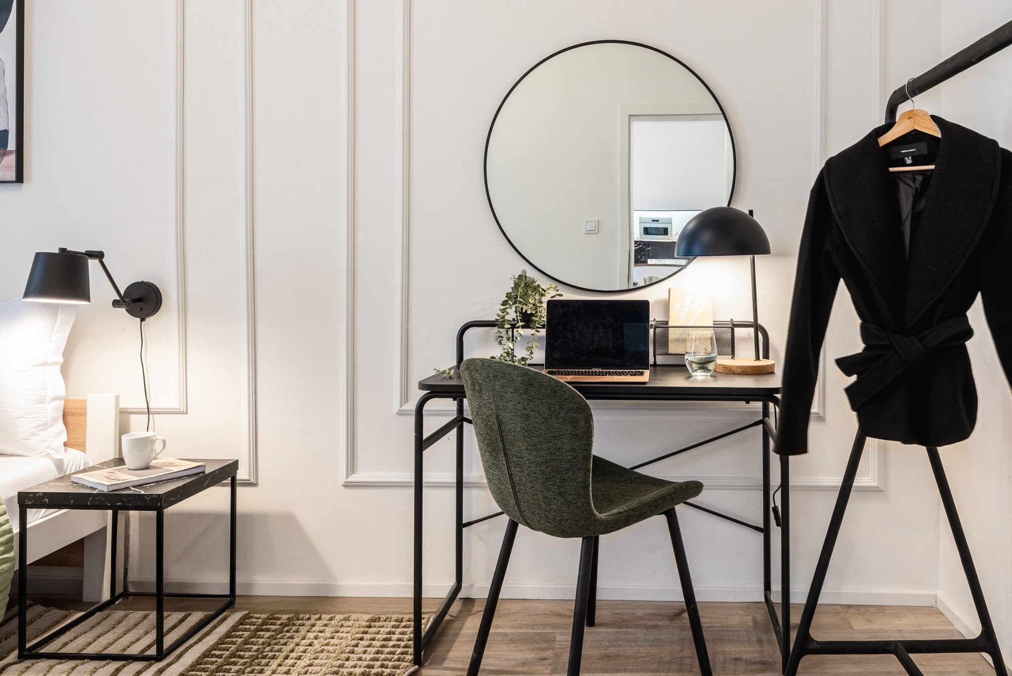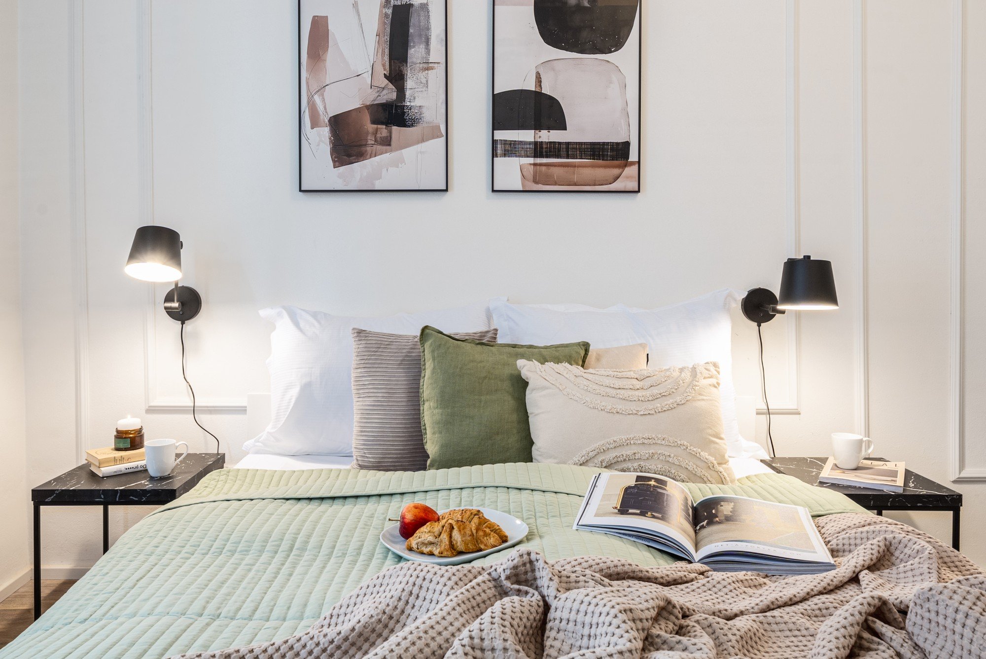Kompletné zariadenie trojizbového bytu vznikalo s rešpektom k jeho charakteru aj existujúcim prvkom. Dekoratívne lišty, zlaté akcenty a výrazné pohovky, ktoré už boli súčasťou interiéru, sa stali východiskovým bodom celého konceptu. Návrh kládol dôraz na svetlo, funkčnosť a vizuálnu príťažlivosť, aby byt fungoval nielen esteticky, ale aj prakticky v režime krátkodobého prenájmu.