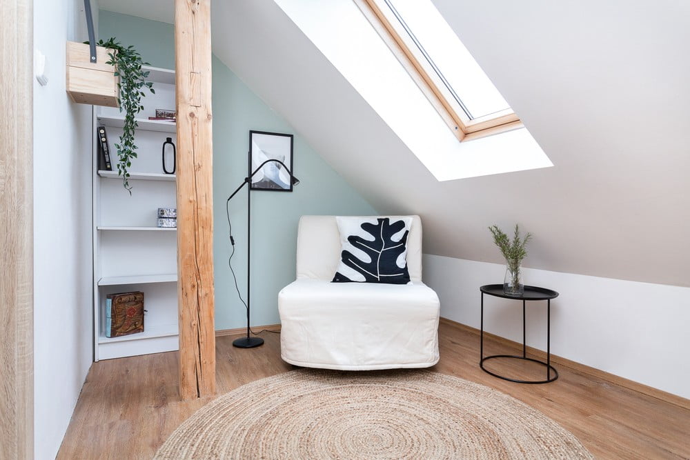 V jednej z podkrovných miestností vytvorili dizajnérky aj útulnú pracovňu. Ako základ zvolili väčšinu vybavenia v bielej farbe, vďaka čomu priestoru zaistili dostatočnú svetlosť. Tú doplnili sviežou mentolovou farbou, ktorú použili na dvoch protiľahlých stenách pod šikminami.