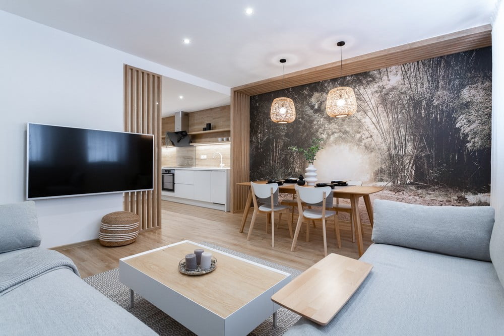 Ústredným motívom obývacej časti sa stala fototapeta s prírodným motívom, zarámovaná modulom z lát v drevenom dekore. Prírodný štýl dizajnérky doladili prútenými dekoráciami, osvetlením a ratanovými taburetkami. Zelená farba sa tak do celého interiéru premieta nielen vďaka fotomotívu, ale aj vďaka živým kvetom.