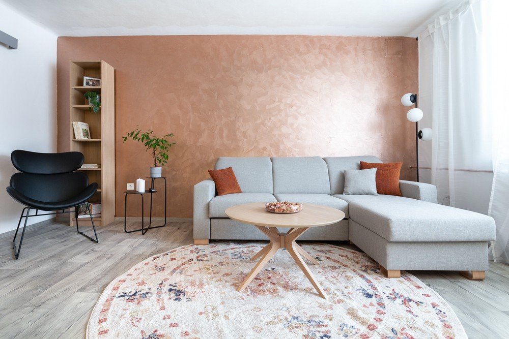 Spojovacím prvkom celého interiéru sa stala medená farba. Najväčšia a najdominantnejšia z nich je stierka na stene obývacej izby. Dizajnérky s ňou udali základ farebnej palety, ktorú doplnili neutrálnymi a tlmenými farbami.