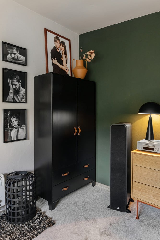 Najväčšiu pozornosť som zamerala na komodu pre gramofón. Celá táto stena má slúžiť zvuku a zároveň poňať aj veľké množstvo gramodosiek. Tiež je to na malom priestore pomerne veľký a výrazný kus nábytku.