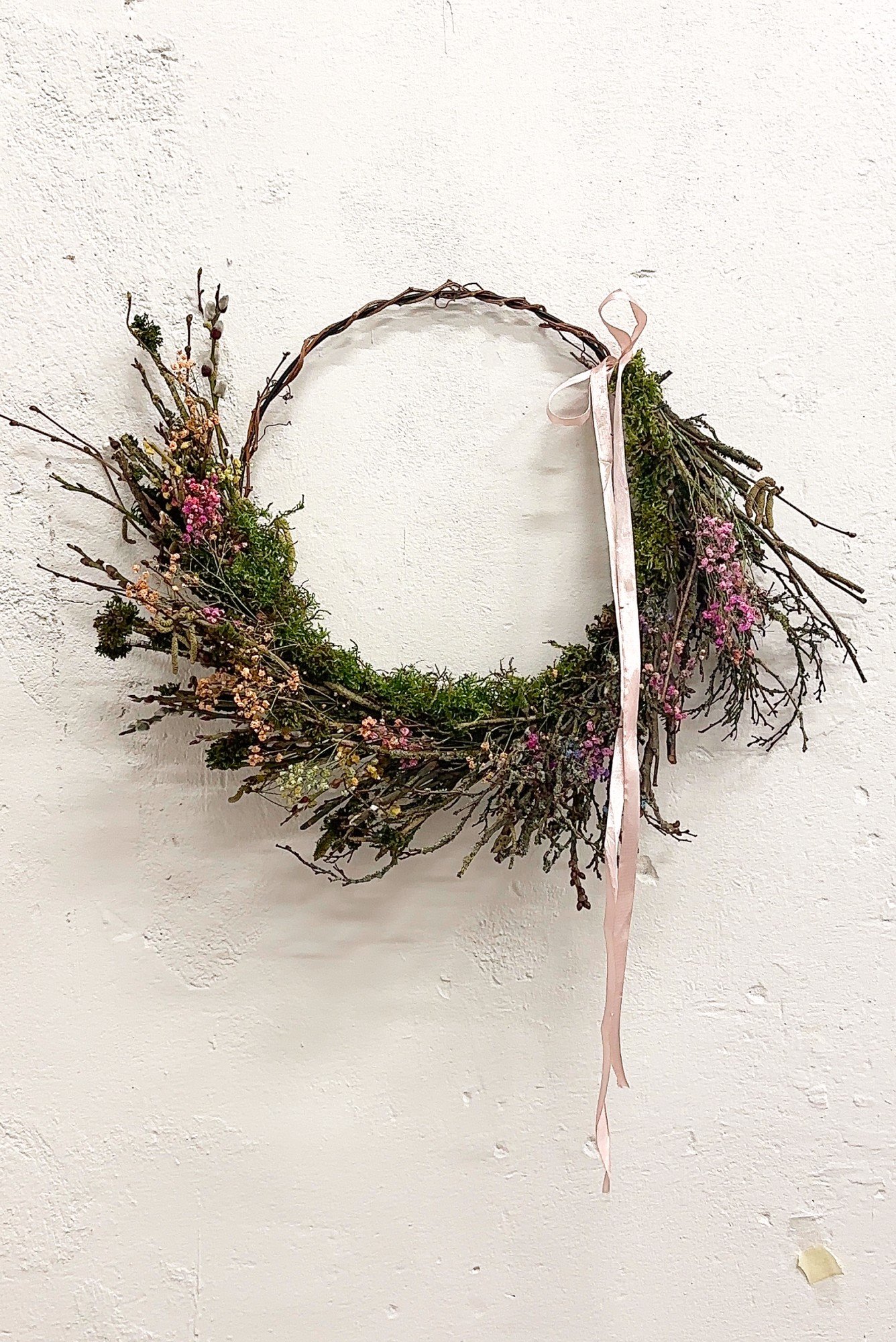 Jarný veniec na stôl z machu zdobený cibuľovinami