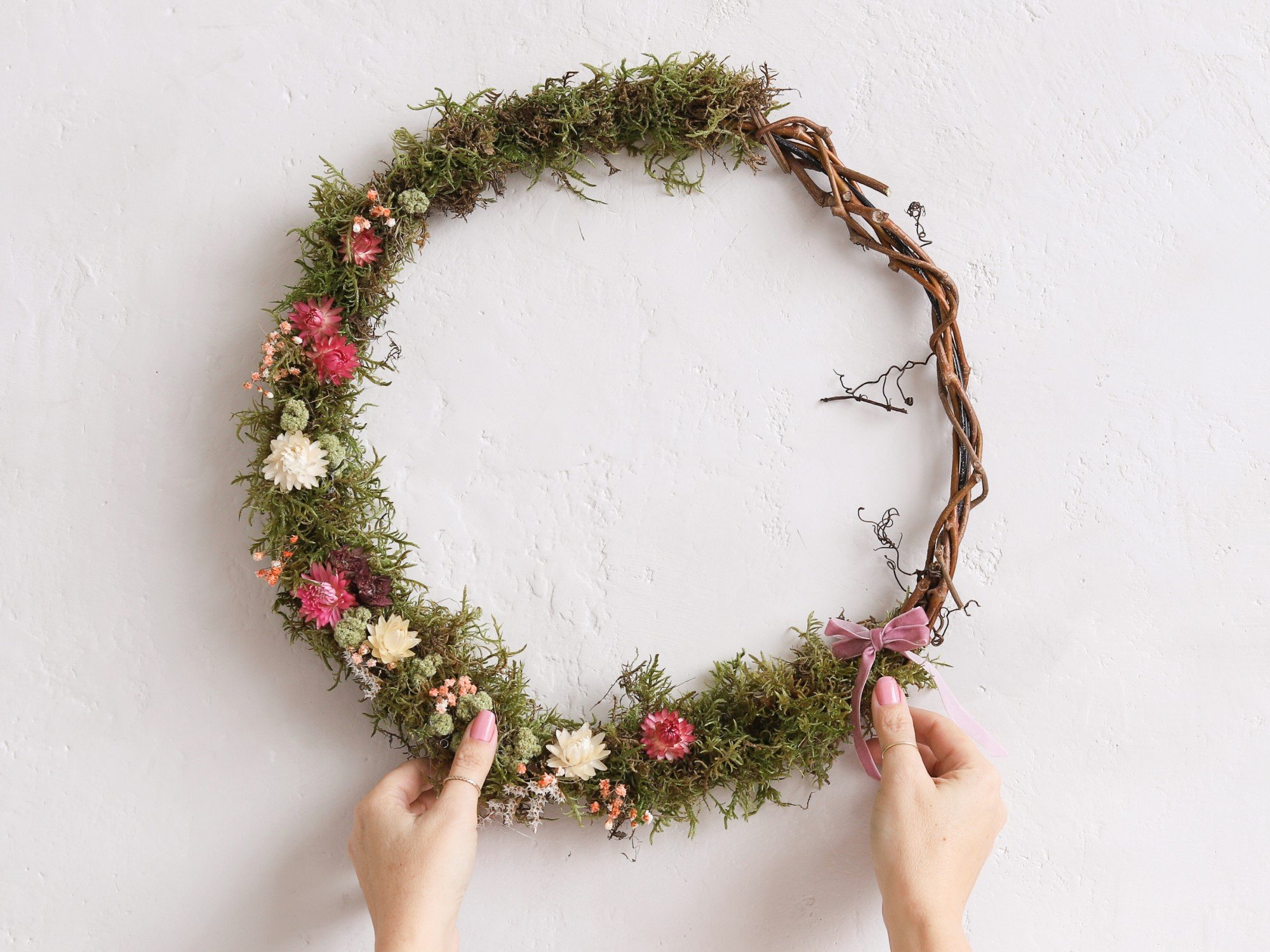 Jarný veniec s ružovými a bielymi iskerníkmi vydrží vďaka základu z aranžovacej hmoty.