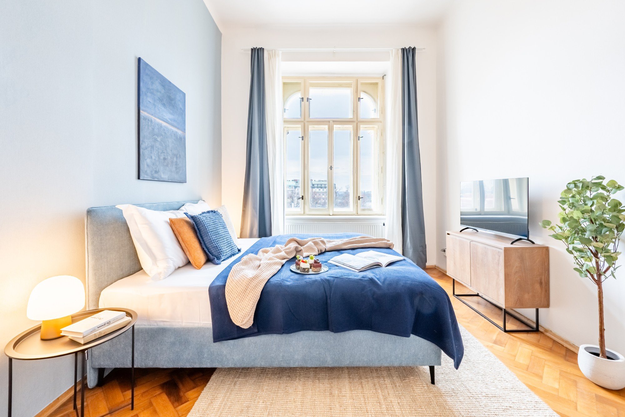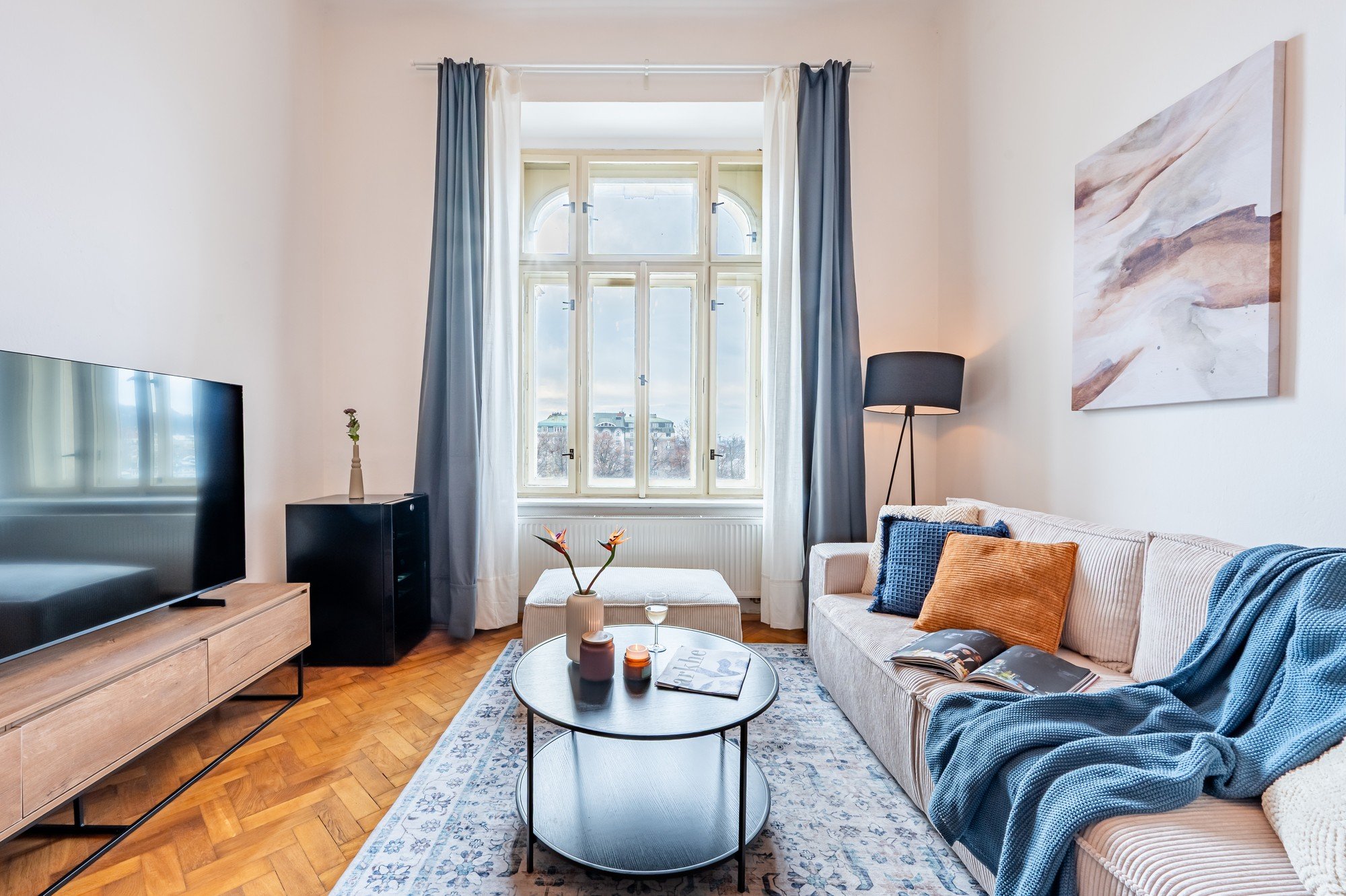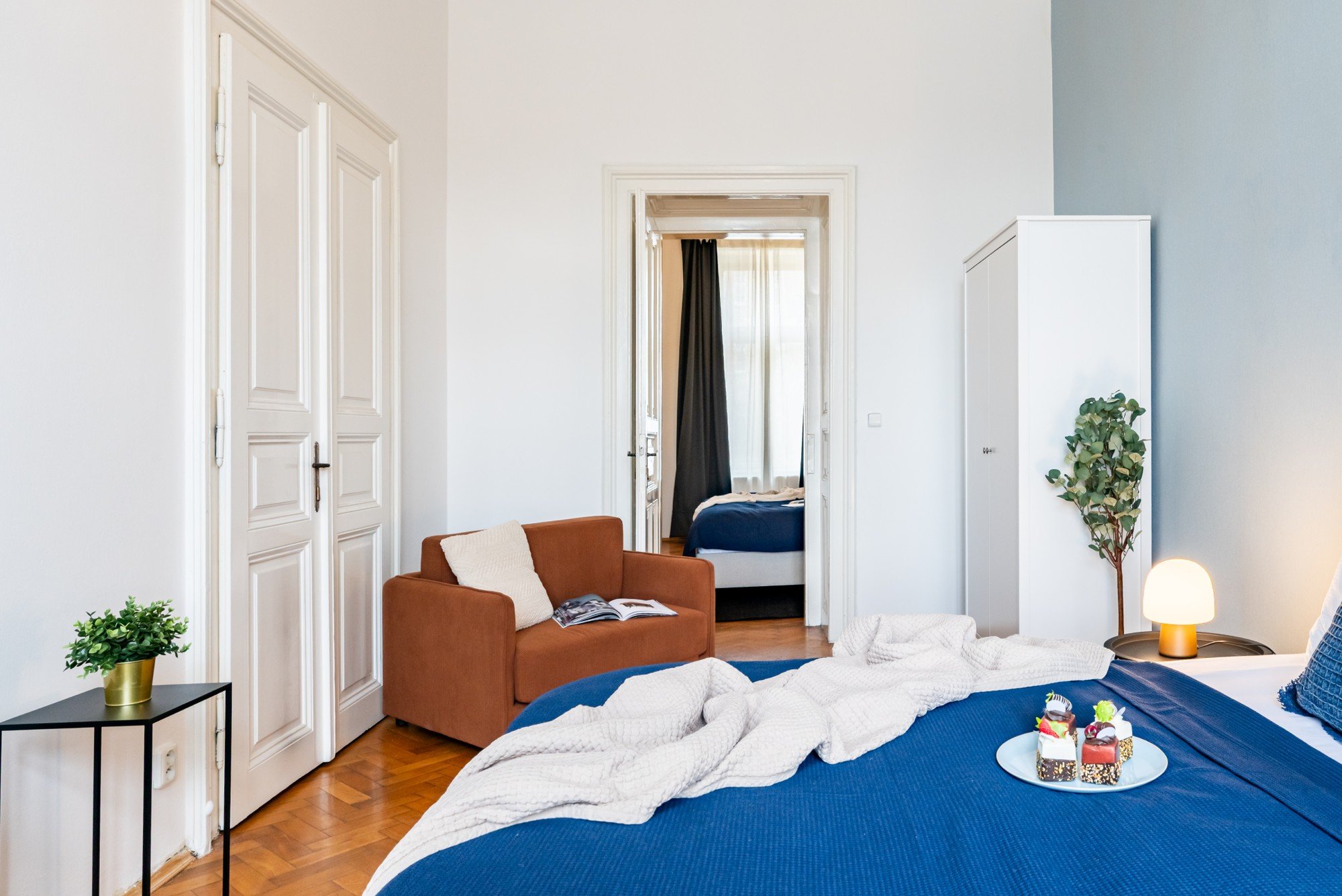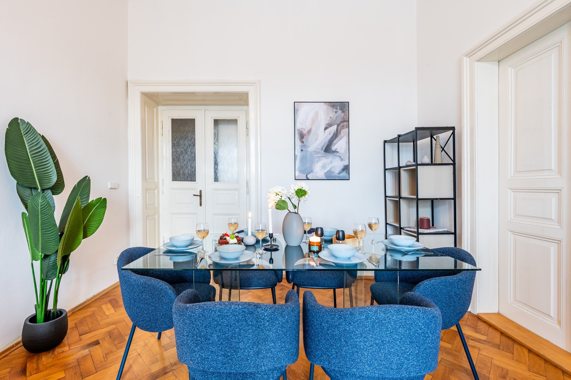 Vzdušný byt v historickom dome spája veľkorysé proporcie s premyslenými detailmi. Vysoké stropy, pôvodné parkety a kontrast tmavého dreva s jemnými odtieňmi modrej vytvárajú nadčasový interiér, ktorý je pokojný, elegantný a prirodzene útulný. Dispozícia navrhnutá pre každodenný život aj spoločné chvíle dokazuje, že komfort a charakter môžu ísť ruka v ruke.