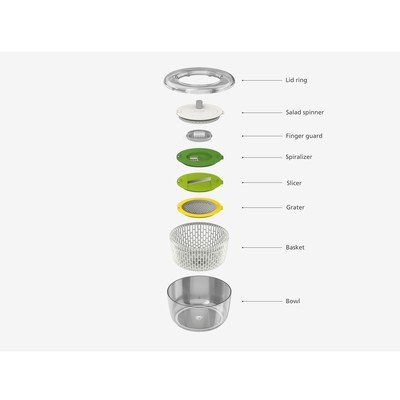 Nechajte sa nalákať na vyladené kuchynské náčinie od značky Joseph Joseph. Základom tejto súpravy Multi-Prep je šalátová rotačná odstredivka, ktorá slúži pre dôkladné umytie a následné vysušenie vypraného šalátu. Následne možno stredový disk vo veku nádoby nahradiť diskom slúžiacim na špirálové krájanie, plátkovanie či strúhanie zeleniny. Po umytí a osušení všetkých nástavcov ich potom jednoducho uložíte do vnútorného koša rotačnej odstredivky. Celú súpravu umývajte len ručne, pri umývaní aj práci navyše dbajte na bezpečnosť, aby nedošlo k poraneniu ostrými čepeľami krájačov. Radšej udržujte mimo dosahu detí. Misa je určená len pre prípravu šalátov, nie je vhodná pre následné skladovanie potravín. Nie je vhodná ani pre použitie v mikrovlnnej rúre. Všetky použité plastové materiály sú zdravotne nezávadné bez obsahu BPA.
