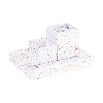 Je vyrobený z pevnej recyklovanej lepenky potiahnutej papierom, ktorý pochádza z lesov obhospodarovaných s ohľadom na ekológiu a udržateľnosť. Spodná strana organizérov je pogumovaná, aby nepoškodila dosku stola.
