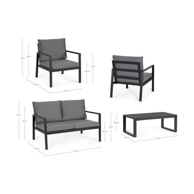 Pohovka ponúka rozmery 117,5 x 73,5 x 76 cm, s výškou sedu 39,5 cm a výškou podrúčky 55 cm. Každé z kresiel má šírku 63 x 73,5 x 76 cm, pričom výška sedu je taktiež 39,5 cm a výška podrúčky 55 cm. Stolík s lamelovou doskou dopĺňa súpravu svojimi rozmermi 92 x 51,5 x 34,5 cm. Celá súprava je vyrobená z hliníka, čo zaisťuje jej ľahkosť a odolnosť.