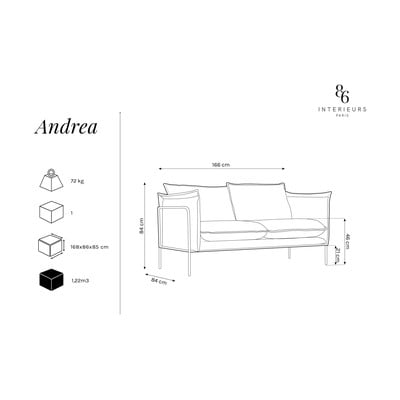 Prineste do svojej domácnosti pohodlné a štýlové kúsky. Pohovka Andrea od Interieurs 86 vás zaujme svojím farebným vzhľadom s čiernym rámom, ktorý podčiarkuje jej moderný dizajn. Príjemný povrch tvorí zo 70 % polyester z recyklovaných PET fliaš a tiež technológia, vďaka ktorej je čistenie škvŕn jednoduchšie. Poznámka: na čistenie odporúčame použiť jemnú kefu. Vyvarujte sa prudkým pohybom a nepoužívajte vysávač.