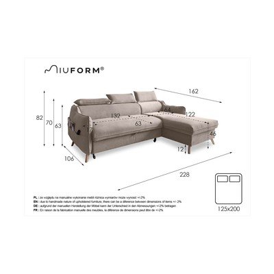 Polohovacia/rozkladacia/s úložným priestoromPravý roh/s leňoškouBéžováTrojmiestnaŠírka 228 cmHĺbka 162 cmHĺbka sedadla 63 cm