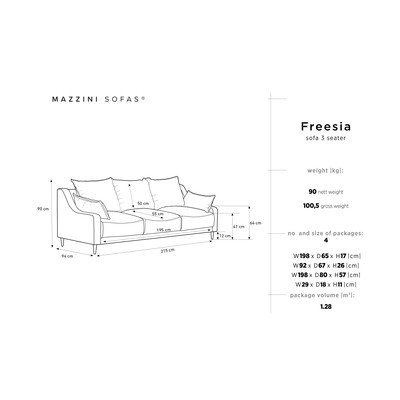 Pohovka Mazzini Sofas Freesia ponúka pevnú konštrukciu z dreva a drevotriesky, ktorá udrží až 350 kg! O najväčší komfort sa postará kvalitná výplň z mäkučkej peny. Chvíľku relaxácie si zaslúžite. Odpočívajte štýlovo na sedačke Freesia.