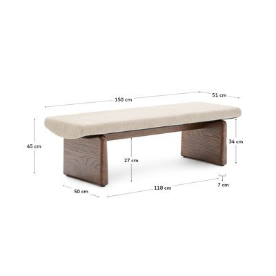 Ženilková, drevená/polstrovaná, béžová/v tmavo prírodnej farbe, šírka 150 cm, hĺbka 51 cm, výška 45 cm