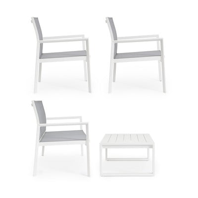 Biela hliníková záhradná lounge súprava Kallen od značky Bizzotto sa skladá z pohovky, dvoch kresiel a stolíka. Súprava je ideálnou voľbou pre oddych na terase, záhrade či pri bazéne. Konštrukcia súpravy je vyrobená z hliníka, ktorý je odolný voči poveternostným vplyvom. Pohovka s rozmermi 126 x 67,5 x 82 cm a kreslá 68 x 67,5 x 82 cm majú pohodlné podrúčky a operadlá. Praktický stolík s rozmermi 90 x 56,5 x 34 cm poskytuje dostatok priestoru na odloženie nápojov a občerstvenia. Moderný dizajn súpravy dopĺňa sivá textília, ktorá tvorí výplň sedákov a operadiel. Vďaka neutrálnej farebnej kombinácii sa súprava ľahko zladí s ostatným záhradným nábytkom a doplnkami.