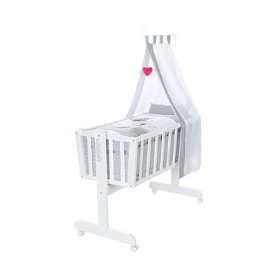 Súčasťou súpravy je matrac, hniezdo, baldachýn s držiakom a súprava koliesok s brzdami. Poťah matraca a vankúšika (40 x 35 cm) aj perinka (80 x 80 cm) sú vyrobené zo 100% bavlny. Výplň detskej prikrývky tvorí priedušné a teplotne regulujúce klimatické vlákno.