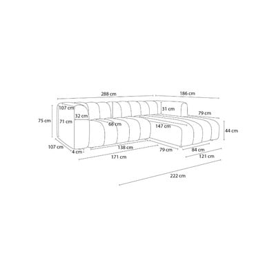 Pravý roh/s leňoškou, biela, štvormiestna, šírka 288 cm, hĺbka 186 cm, hĺbka sedadla 68 cm