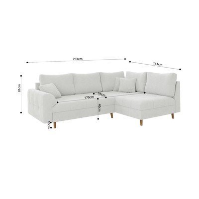 Z textílie buklé, pravý roh/do L, biela, trojmiestna, šírka 231 cm, hĺbka 161 cm, hĺbka sedadla 58 cm