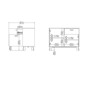 S rozmermi 99x73x39 cm ponúka dostatok úložného priestoru v troch uzavretých dieloch a jednej zásuvke. Biele dvierka a zásuvky kontrastujú s prírodným dubovým dekórom rámu a šikmých nôh, čo vytvára štýlový vzhľad. Drevené úchyty dokonale ladia s celkovým designom.