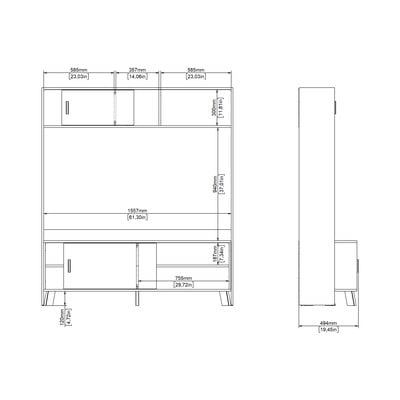 Táto 159x181x48 cm veľká skrinka v bielo-dubovom prevedení ponúka dostatok úložného priestoru pre vašu elektroniku a doplnky. Horná a spodná časť obsahujú posuvné dvere pre ľahký prístup, zatiaľ čo otvorené police poskytujú priestor na dekorácie alebo často používané predmety. Spodný úložný priestor s prepážkou a dvoma policami je ideálny na diskrétne uloženie.