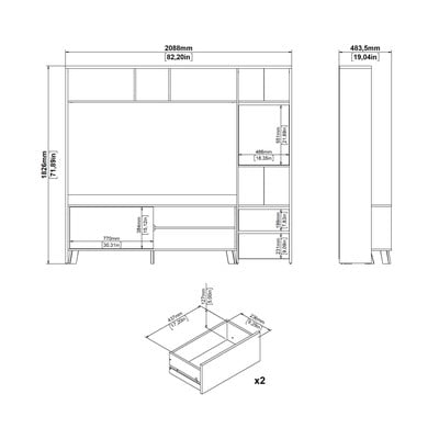 Next TV zostava od značky Tvilum kombinuje škandinávsky štýl s praktickosťou. Bielo-dubový dizajn s rozmermi 209x183x48 cm ponúka elegantné riešenie pre vašu obývaciu izbu. Zostava zahŕňa otvorené police s prepážkami, skrytý úložný priestor, spodnú otvorenú časť s posuvnými dvierkami a dva priestranné šuplíky. Ideálne na usporiadanie vašich médií a elektroniky, pričom dodáva priestoru moderný vzhľad.