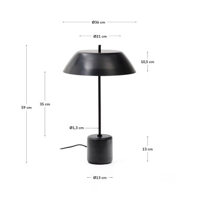 Stolová lampa Sayra od značky Kave Home vnesie do vášho interiéru minimalistickú eleganciu. Lampu tvorí jkovové tienidlo v čiernej farbe, ktoré je usadené na štíhlej tyči. Stabilitu lampe dodáva okrúhla základňa z čierneho mramoru, vďaka ktorému je každý kus originálom s jedinečnou kresbou a textúrou. Lampa Sayra je kompatibilná so žiarovkami typu E27 s maximálnym výkonom 40 W. Žiarovka nie je súčasťou balenia.