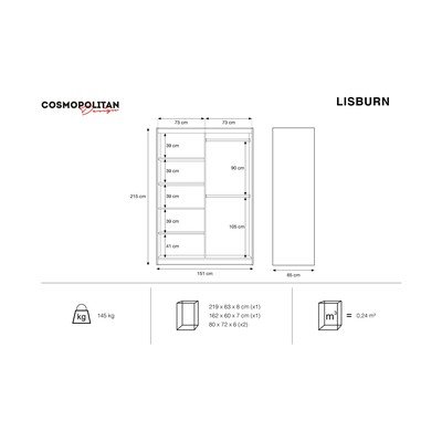 Šatníková skriňa Lisburn prinesie do vašej domácnosti štipku moderného štýlu. Na prvý pohľad vás zaujme posuvnými dverami so zrkadlom. Vďaka jednoduchému, avšak štýlovému dizajnu si nájde svoje miesto ako v spálni, tak napríklad aj vo vašej chodbe.
