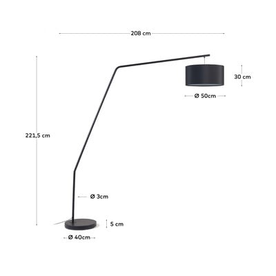 Stojacia lampa Ciana značky Kave Home je vyrobená z kovu s čiernou povrchovou úpravou. Lampa má jednoduchý moderný dizajn s dlhým ramenom a okrúhlym textilným tienidlom. Pokiaľ budete časom túžiť po zmene, tienidlo sa dá ľahko vymeniť za iné. Lampa je kompatibilná so žiarovkami s päticou E27 s maximálnym výkonom 32 W.
