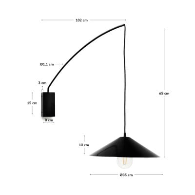 Nástenné svietidlo Kally od značky Kave Home je ideálnym doplnkom pre tých, ktorí hľadajú originálne a štýlové osvetlenie. Svietidlo je vyrobené z kovu a zaujme svojím netradičným tvarom s kónickým tienidlom zaveseným na textilnom kábli. Pre použitie je potrebné dokúpiť žiarovku s päticou E27 s maximálnym výkonom 40 W.