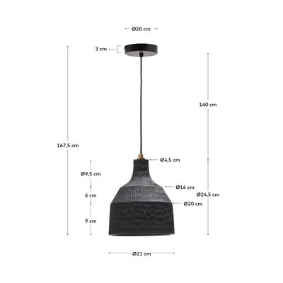 Závesné svietidlo Amire od značky Kave Home v sebe spája prírodný materiál s moderným dizajnom. Tienidlo s priemerom 21 cm je vyrobené z dreva s tmavou povrchovou úpravou, ktorá je výsledkom tradičnej techniky vypaľovania. Svietidlo je kompatibilné so žiarovkami typu E27 s maximálnym výkonom 25 W (žiarovka nie je súčasťou balenia).