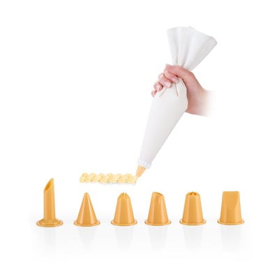 Ideálny pomocník na dekorovanie a plnenie pokrmov. Vyrobené z kvalitného nepresakujúceho bavlneného plátna a odolného plastu. Pred prvým a po každom použití umyte vrecko aj trysky pod tečúcou vodou, trysky sú vhodné do umývačky.