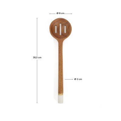 Táto funkčná a zároveň dekoratívna vareška s tromi pozdĺžnymi otvormi je ideálny pomocník do vašej kuchyne. Jej rukoväť je zakončená kovovým krúžkom a koncovkou z odlišného materiálu, čo pridáva na jej elegantnom vzhľade.