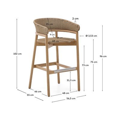 Barová stolička Arinella od značky Kave Home. Vďaka ručne tkanej šnúre odolnej voči UV žiareniu je vhodná na použitie v interiéri aj exteriéri.