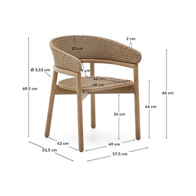 Drevená záhradná stolička Arinella od značky Kave Home. Vďaka ručne tkanej šnúre odolnej voči UV žiareniu je vhodná na použitie v interiéri aj exteriéri.