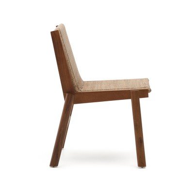 Drevená záhradná stolička Itani od značky Kave Home. Konštrukcia z masívneho akáciového dreva a sedadlo z ručne tkaného syntetického ratanu sú vhodné na použitie v interiéri aj exteriéri.