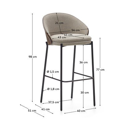Elegantná barová stolička Eamy od Kave Home prináša štýl a pohodlie do každého interiéru. Stolička s výškou sedadla 77 cm je ideálna pre moderné kuchyne či bary. Je vybavená plastovými podložkami, ktoré chránia podlahu pred poškriabaním. Ergonomický dizajn a kvalitné materiály zaisťujú komfortné posedenie a dlhú životnosť. Perfektná voľba pre tých, ktorí hľadajú spojenie funkčnosti a estetiky.
