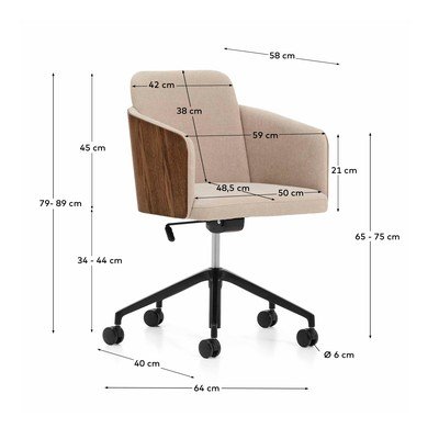 Kancelárska stolička Madai od značky Kave Home je navrhnutá pre pohodlie a funkčnosť. Jej sedadlo a operadlo sú čalúnené ženilkou, zatiaľ čo vonkajšia strana operadla je z jaseňovej dyhy.