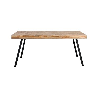Jedálenský stôl od značky White Label má vrchnú dosku z recyklovaného teaku s povrchovou úpravou z prírodného laku na vodnej báze. Vzdialenosť medzi čiernymi kovovými nohami je 127 cm.