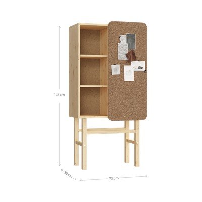 Inteligentné prepojenie knižnice a nástenky prináša značka Karup Design. Konštrukcia je vyrobená z borovicového dreva. Je doplnená o korkovú nástenku, za ktorou sa skrýva ďalší úložný priestor, ktorý odhalíte jedným malým posunom. Poznámka: Borovicové drevo môže obsahovať uzly, ktoré nie sú chybou. Jeho povrch sa môže časom meniť (farba, tvar) vplyvom okolitého prostredia (napr. slnečného žiarenia a pod.). Starostlivosť: Neklaďte na nábytok horúce predmety, neklaďte sviečky priamo na nábytok, rozliate tekutiny ihneď zotrite vlhkou handričkou, pravidelne kontrolujte, či skrutky a kovanie pevne držia