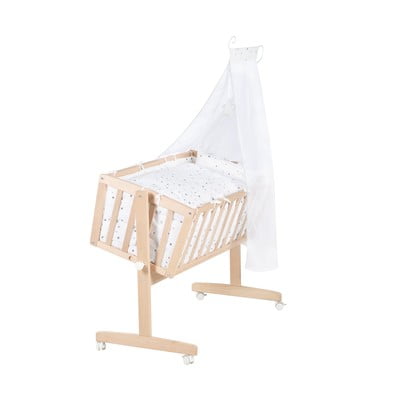 Textílie kolísky sú vyrobené zo 100m % bavlny bez škodlivých látok a ponúkajú optimálnu klímu pre spánok. Súprava obliečok sa skladá z obliečky na vankúš (40 x 35 cm) a obliečky na perinu (80 x 80 cm). Detská prešívaná prikrývka je vyrobená z priedušného a teplotu regulujúceho klimatického vlákna.