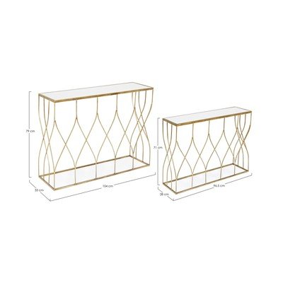 Konzolové stolíky v súprave dvoch kusov Elenor od značky Bizzotto. Vnesú do vášho domova štipku luxusu a elegancie svojím zlatým prevedením a prepracovaným dizajnom podnožia.