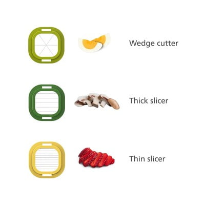 Tento ručný krájač Joseph Joseph je praktickým pomocníkom pre ľahké krájanie vajec, mäkkého ovocia alebo húb. Ponúkne tri rôzne antikoro rezné nástroje, ktoré umožňujú krájanie na klinky, tenké prúžky alebo hrubšie plátky. Pre pohodlnú manipuláciu a čistotu pri práci je krájač vybavený priehľadným zásobníkom s protišmykovou základňou. Po dokončení práce je možné všetky časti ľahko zložiť do kompaktného tvaru šetriace miesto pri skladovaní.