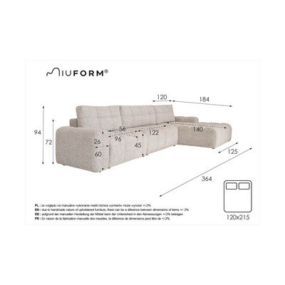 Rozkladacia/s úložným priestoromPravý rohKrémovobielaViacmiestnaŠírka 364 cmHĺbka 184 cmHĺbka sedadla 56 cm