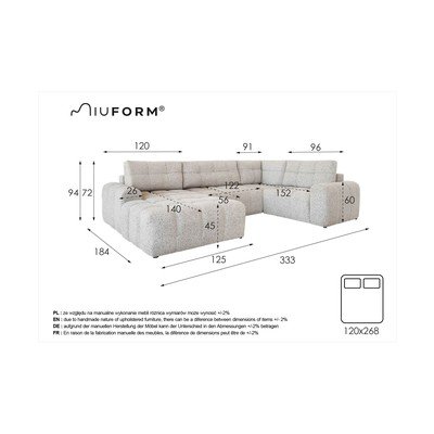 Rozkladacia/s úložným priestoromPravý rohKrémovobielaŠtvormiestnaŠírka 333 cmHĺbka 213 cmHĺbka sedadla 56 cm