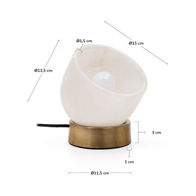 Stolová lampa Shenli od značky Kave Home v sebe spája eleganciu mosadze a teplý vzhľad alabastru. Lampa s výškou 17 cm má kovovú základňu v mosadznej farbe, na ktorej spočíva otočné tienidlo z alabastru. Prírodné alabastrové tienidlo vytvára pri rozsvietení jedinečnú hru svetla a tieňa, ktorá dodá interiéru útulnú atmosféru. Vďaka možnosti otáčania tienidla si môžete smer svetla ľubovoľne upraviť podľa potreby. Lampa je kompatibilná so žiarovkami typu E27 s maximálnym výkonom 25 W. Žiarovka nie je súčasťou balenia.