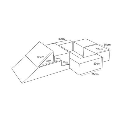 Súprava sa skladá z mäkkých blokov potiahnutých manšestrom, ktorý je príjemný na dotyk a ľahko sa udržuje v čistote, čo zaisťuje hygienické prostredie pre hranie. Z jednotlivých dielov je možné zostaviť rôzne konfigurácie – od pohodlnej pohovky cez bezpečný bazénik s loptičkami až po plnohodnotné ihrisko. Mäkké, ale zároveň stabilné tvary zaručujú bezpečné prostredie pre všetky energické aktivity.