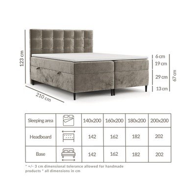 Táto boxspring posteľ kombinuje vysokokvalitný matrac z bonellových pružín a polyuretánovej peny a obojstranný topper z elastickej polyuretánovej peny. Topper nielenže prináša zvýšený komfort pri spánku, zároveň spoľahlivo chráni matrac pred poškodením a znečistením. Jeho snímateľný poťah s výťažkom z rias je možné kedykoľvek sňať a vyprať pri teplote do 40 ⁰C.