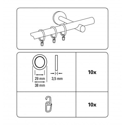 10-dielna súprava krúžkov s háčikom od značky Gardinia predstavuje ideálny doplnok najmä k roztiahnuteľným garnižam z kolekcie Elba - napríklad s dĺžkou