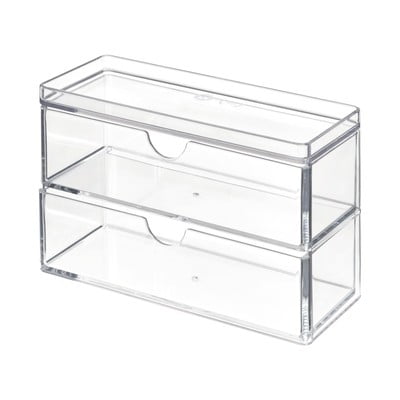 Organizér na vatové tampóny značky iDesign/The Home Edit je vyrobený z mimoriadne odolného plastu. Vďaka svojej veľkosti sa tak akurát zmestí do kúpeľňových skriniek a na úzke poličky.