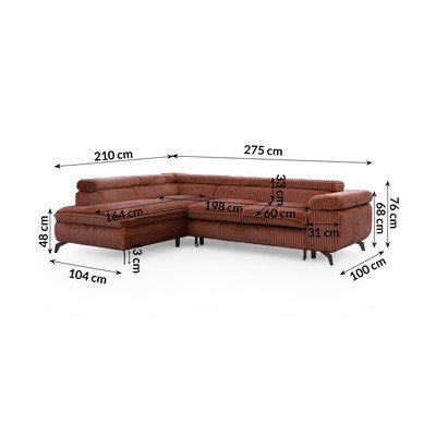 MenčestrováPolohovacia/rozkladacia/s úložným priestoromĽavý roh/do LV terakotovej farbeVhodná pre domácich miláčikov/odolná proti škvrnámŠtvormiestnaŠírka 275 cm